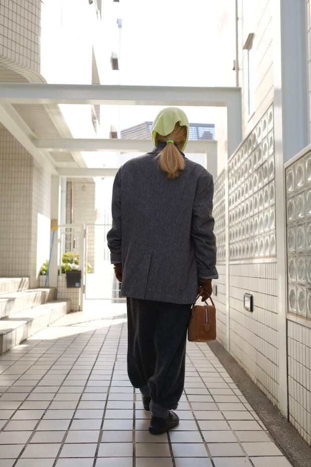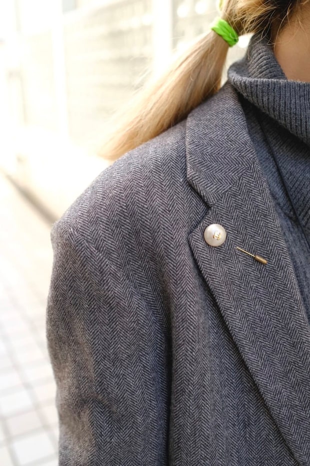 そんな杉浦さんが2019年に購入したというのがメンズのテーラードジャケットです。クラシックなへリーンボーン生地を使用した本格派で、なんとアンダー4,000円で手に入れたそう。「メンズのXLサイズなので、購入時は家族からは大反対されたんです。こんな大きいのおかしいよって(笑)。でも2、3年前からビッグシルエットの流れがきたので、右肩上がりで大活躍しています」