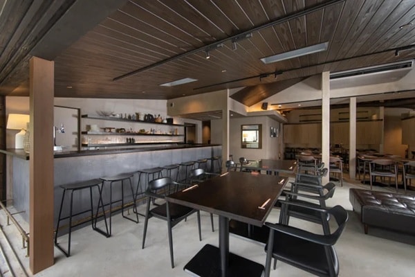 京町家を改装した京都らしい一軒家は、高い天井とオープンテラスを備え、心地よい開放感に満ちた空間。店内は、土や自然を思わせるアースカラーを基調に、円山公園の景観と調和するように設えている。和の要素を取り入れつつ、シンプルでモダンな家具を配し、肩肘張らずに食事を楽しめる空間だ。