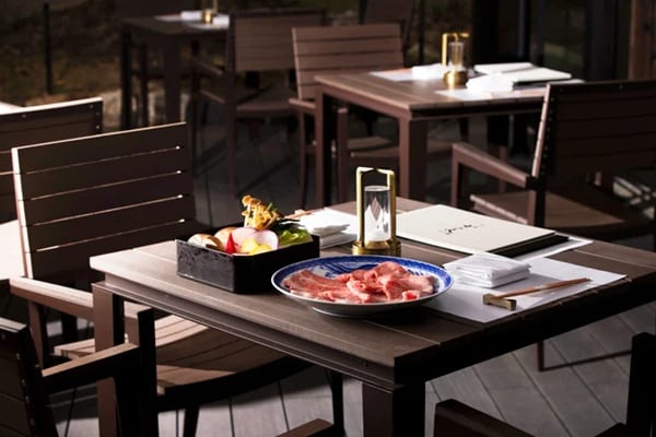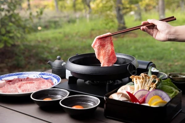 60分のすき焼き食べ放題は、9,900円(税込)。公園一帯に広がる新緑や満開の桜に包まれながら、贅沢なひとときを過ごすことができる。
