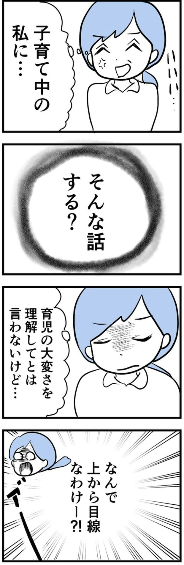 さらに「今どきのお母さんは…」と他人の育児を批判しだし、まゆさんの心にはイラ立ちが募っていきました。