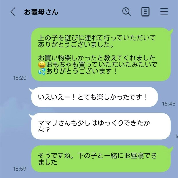 4歳と6か月では、遊び方も違います。少しでも、投稿者さんがのんびり過ごせれば…と、夫と義母が考えてくれたのかもしれません。