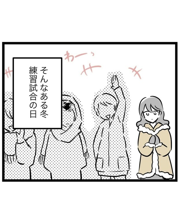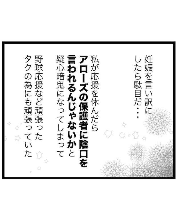 チーム内で孤立し、野球を辞めたいと思いながらも、楽しそうにプレーする息子の姿を見ると踏み切れずにいたもっつんさん。不妊治療を経て新たな命を授かったものの、同じく妊娠中のチーム保護者が元気に応援する姿を見て、休みにくさを感じ、真冬になっても無理をして付き添っていました。