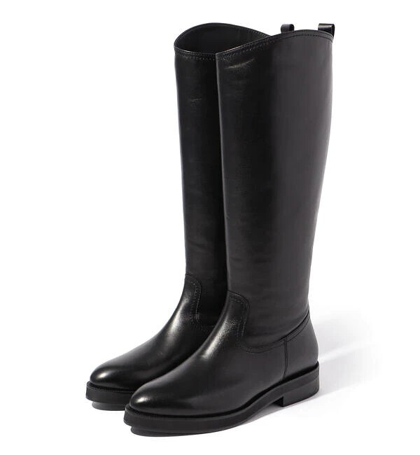 細みのトウと程よい太さの筒にこだわって作ったジョッキーブーツ。スカートにはもちろん、パンツをインしてはいても◎。ボトムを選びません。ブーツ¥48,400(トゥモローランド)