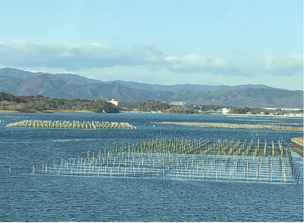 香り高いあおさの名産地である福島県相馬市の松川浦。松川大橋を渡るバスの中からパチリ。最盛期には2万4000本もの柵で、のり網を固定し養殖をしていたとか。震災時の津波ですべての網が流れてしまいましたが、多くの努力で少しずつ復活。2018年には最盛期の約10%にまで回復したそうです