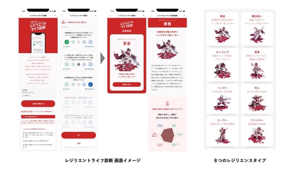 ミニアプリの目玉は、レジリエントライフ診断です。まず、性別、居住地などの個人情報を入力。「3日間程度生活できるだけの飲食料の備蓄を常に行っている」、「保険の契約内容は、定期的に見直している」など、31の質問に答えていくと、個人のレジリエンス能力を「吸収力」「適応力」「変革力」の組み合わせで判定。「勇者」「魔法使い」「ヒーラー」など、8タイプに分類し、強みや補いたい部分をわかりやすく教えてくれます。