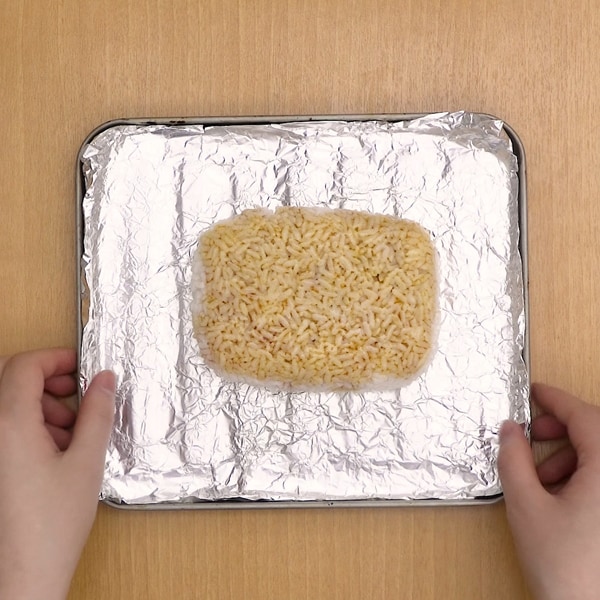 3. パックごはんの容器ごと上下を返すようにして、パックごはんをアルミホイルに取り出す。