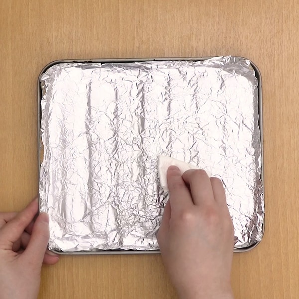 2. 天板にくしゃくしゃにして広げたアルミホイルを敷き、サラダ油を入れて薄くのばす。