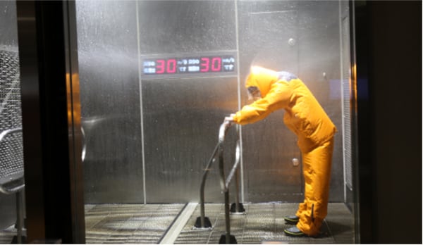 まず、カッパを着用。長靴を履き、フードも被った状態で、転倒防止のため手すりを両手で強く持ちました。最初に雨が降り、その後に風が吹くという流れで、風がだんだん強くなるにつれて立っているだけでも大きな負担を感じました。