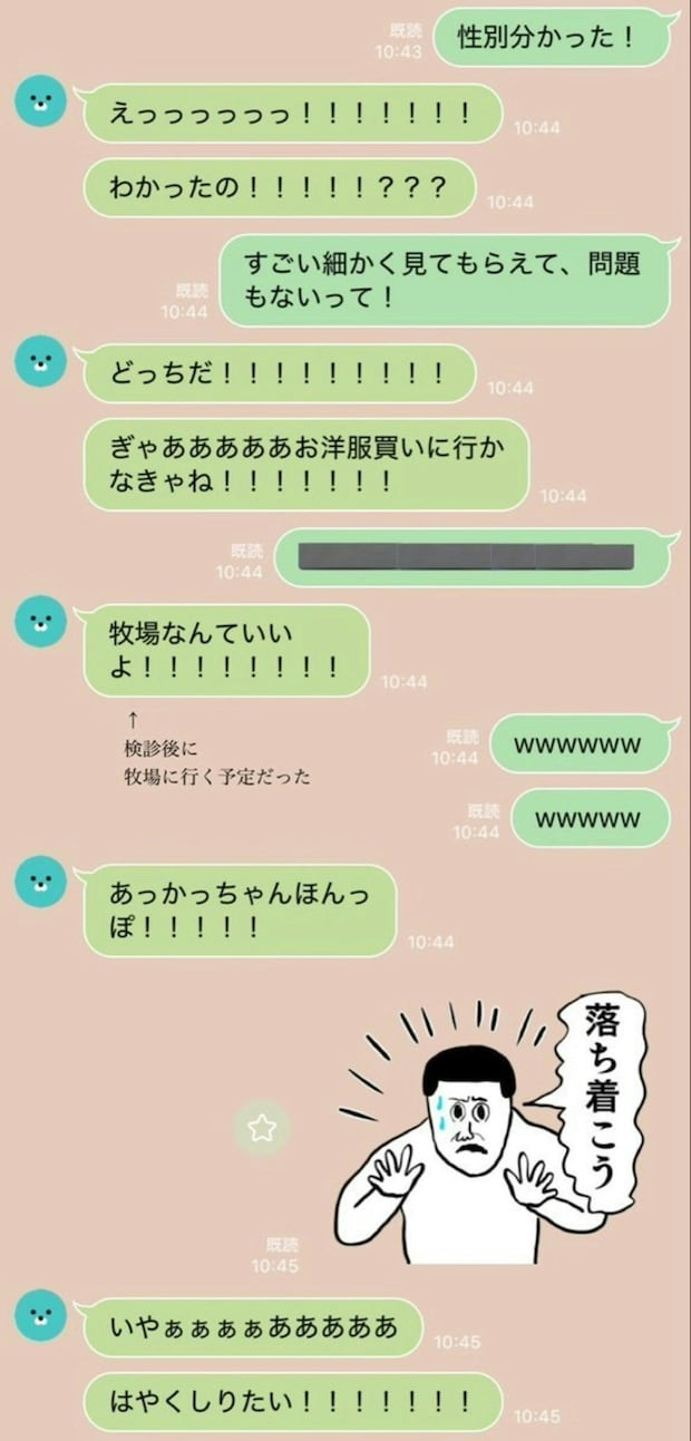 投稿者・ハル(@nameko__Q)さんはある日「性別が分かった!」と夫に報告。夫のウキウキした気持ちが伝わるLINEのトーク画像に「素敵なご夫婦」といった反響が寄せられました。こちらまでうれしくなってしまう、喜びようがこちら!