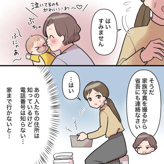 渉が産まれてしばらくした頃、家族写真を撮ると義母が言い出しました。省吾にも連絡なさいと義母に言われた私は、知らされた住所を頼りに夫と愛人が住む家へ行かなければなりませんでした。自分と息子を捨てて愛人のもとで暮らす夫を訪ねていかなければいけないなんて、どんな気持ちで義母は私にそんなことが言えるのか。私の存在はいったいなんなのかという疑問が毎日のように駆け巡りました。