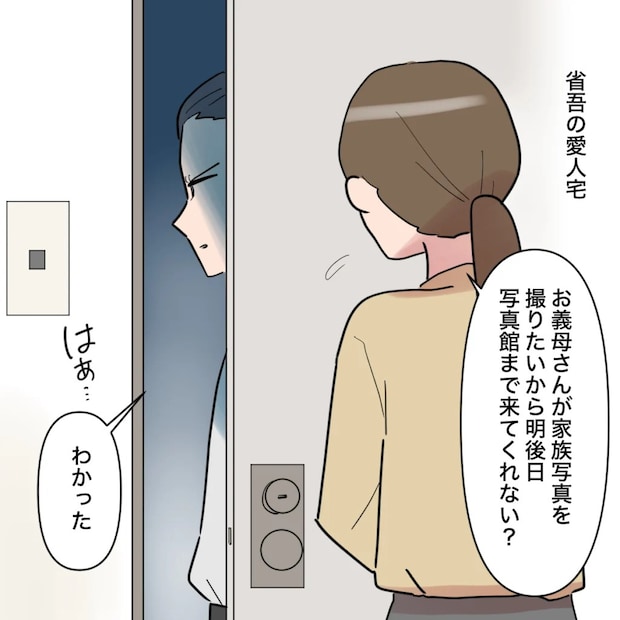 省吾さんが愛人と住む家を訪ねると、不機嫌そうな顔の省吾さんがいました。それでも家族写真を撮るから写真館へ来てほしいと伝えると、ため息をついて省吾さんは「わかった」とそっけなく言ってドアを閉めました。
