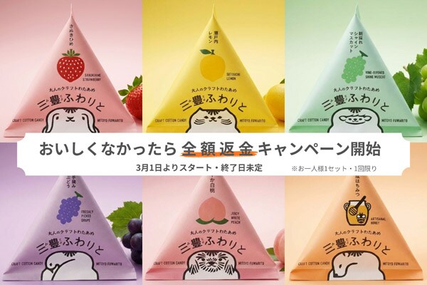 香川県三豊(みとよ)市のロスフルーツを使ったクラフトわたあめ「三豊ふわりと」は、パッケージのリニューアルを記念して、「テトラ全種セット12個入り」を購入した人を対象に「おいしくなかったら全額返金キャンペーン」を3月1日(日)にスタートした。