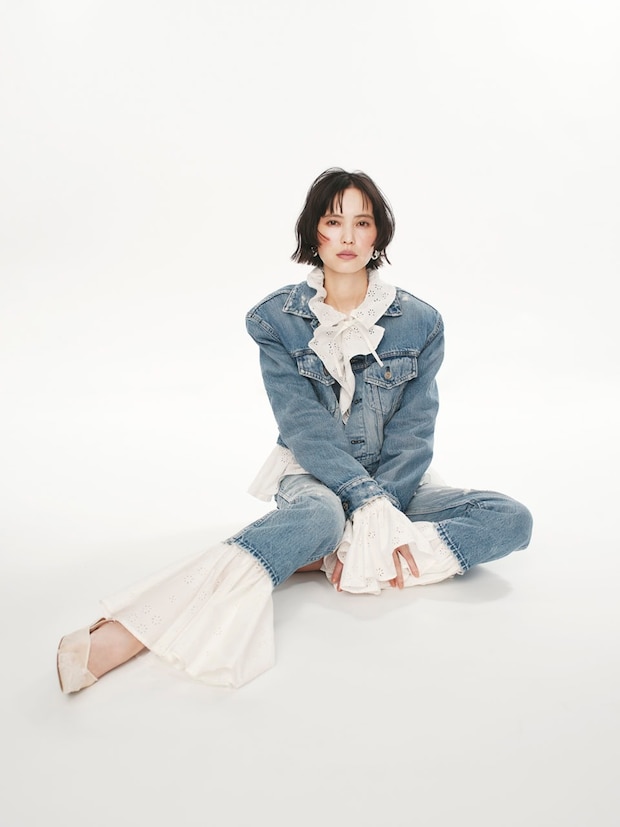 レースブラウス付きデニムジャケット¥110,000、レース付きデニムパンツ¥77,000(共にホリディ/フラッグシップサロンオフィス)、シングルピアス 各¥36,300(共にマリア ブラック/マリア ブラック 表参道店)、シューズ¥140,800※参考価格(ネオス/ザ・ウォール シールーム)