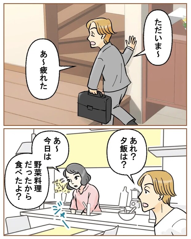 「ただいま~。あ~疲れた」いつものセリフとともに、ツカサが帰宅しました。キッチンで後片付けをしている私のところに来た時にはTシャツとズボン姿のツカサ。また廊下に脱ぎ散らかしてきていることは明らかです。「あれ?夕飯は?」と聞かれたので「あ~今日は野菜料理だったから食べたよ?」とサラリと答えました。