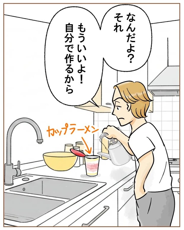 「何だよそれ?もういいよ!自分で作るから」と不貞腐れて、ツカサはカップラーメンにお湯を注ぎだしました。いつもそれ食べているじゃない、私が作っていても。と内心思いました。
