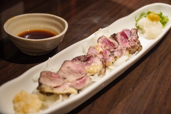 夜に訪れたら、まずは「宮崎地鶏の親鳥たたき」を。豪快に炙られた表面から、炭の香りがふわりと鼻をくすぐる。コリっとした歯ごたえに、薬味を添えて。これはもう、ひと口目から“うまい”が決まってる。