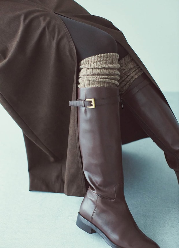 冬の足元の大定番、レザーブーツ。防寒を狙うなら、いつものタイツにソックスをレイヤードするのが賢い手。タイツだけよりコンサバ感も和らぐうえ、スタイリングに立体化も。ソックスが窮屈ならレッグウォーマーが◎。