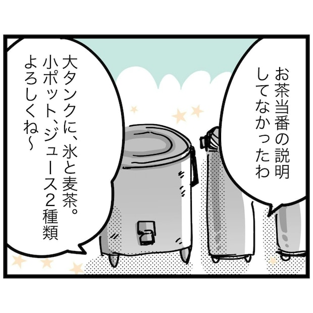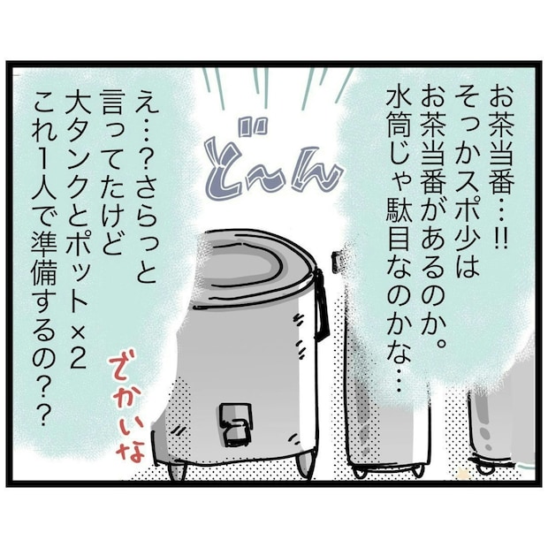 タクくんの強い希望もあり、その場で入団を決めてしまいました。そして、入ってみて初めて知ったのが「お茶当番」。最初に指名された坂上さんは上の子が入団しているため、勝手がわかっているようです。ですが、もっつんさんは、戸惑うばかり…。