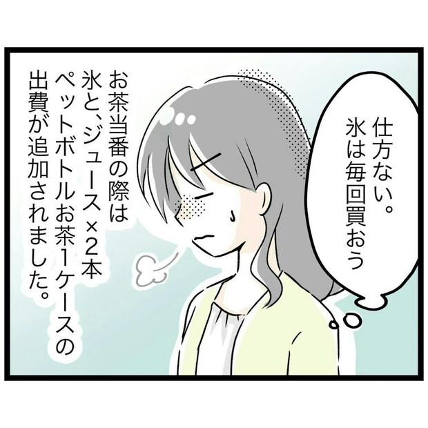 大タンクいっぱいにお茶を用意するのは、大変そうですね…。家庭用の氷では、足りそうもありません。当番制なので、毎回ではありませんが、それでもお茶と氷、さらにジュース代の出費は地味に痛いですね…。