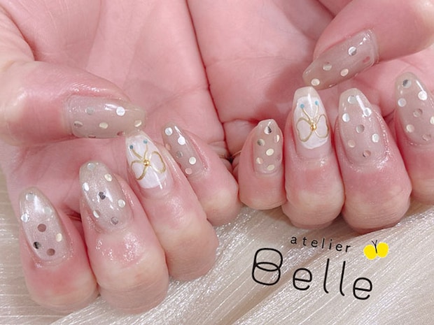 今回は、やわらかなグレージュのネイルカラーをベースに、手描きのリボンアートとドットを合わせた上品なネイルデザインをご紹介いたします。