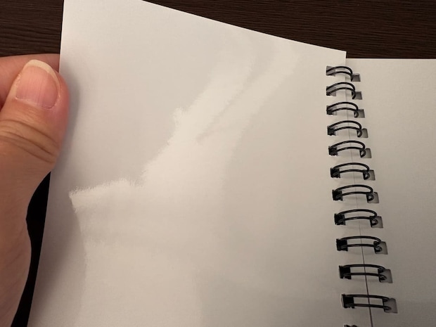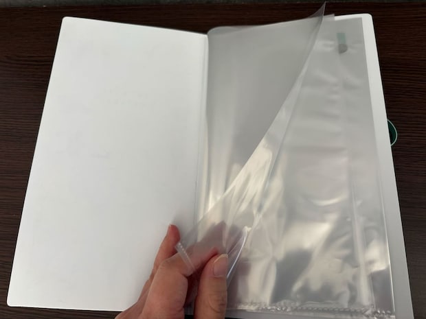 中は無地の24ページで、サイズは約150×112mmと持ち運びにも便利なコンパクトサイズです。材質はポリプロピレンでできており、ページ表面はテカテカでツルッとした質感が特徴となっています。