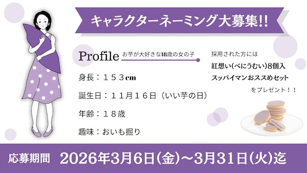採用は、1作品。3月31日(火)頃に公式SNSおよび特設ページ等で発表予定だ。採用された名称の応募者は、キャラクターの「名付け親」として紹介される場合があるとのこと。また、採用特典として「紅想い」8個入・スッパイマンおススめセットが進呈される予定だ。