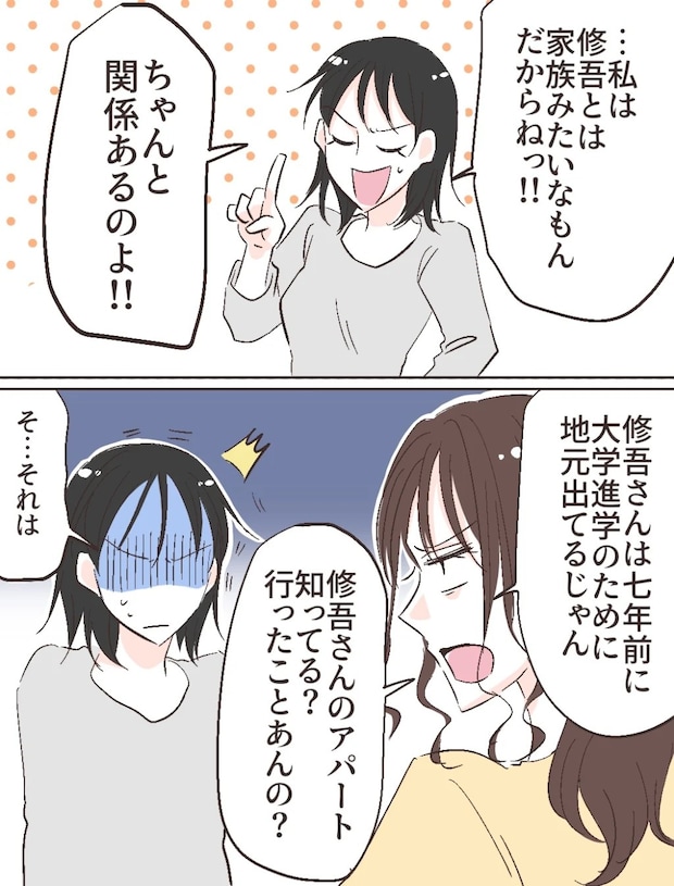 智美さんは一瞬うろたえるも「わ、私は修吾とは家族みたいなもんだからねっ!ちゃんと関係あるのよ」と得意げに言いました。ところが、ふみのから「修吾さんは7年前に大学進学のために地元出てるじゃん、修吾さんのアパート知ってる?行ったことあんの?」と核心を突かれると、ぎくりとした表情で「そ・・・それは」と気まずそうに言葉を濁しました。