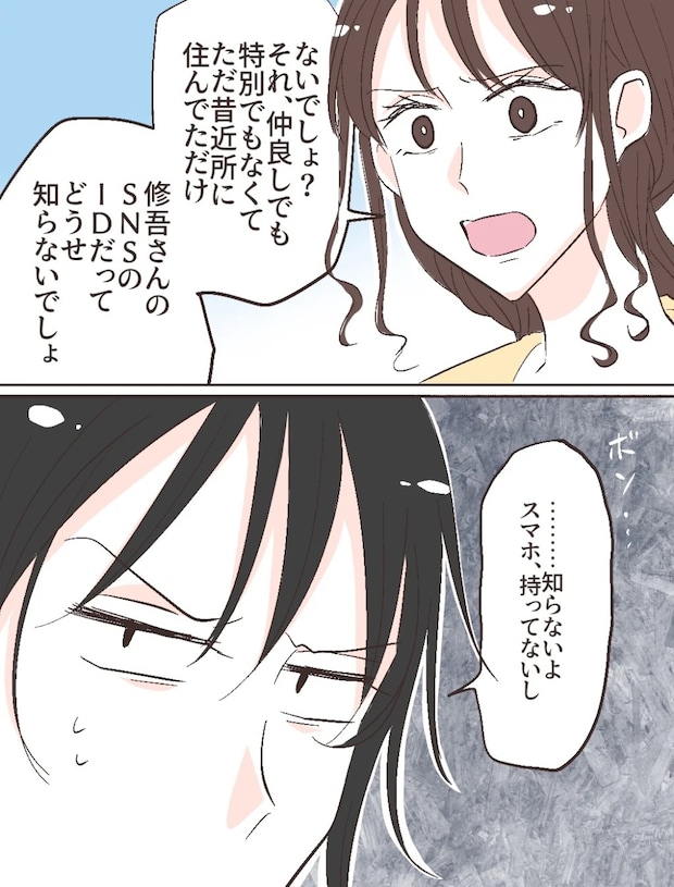 「ないでしょ?それ仲良しでも特別でもなくて、ただ昔近所に住んでただけ、修吾さんのSNSのIDだってどうせ知らないでしょ」ふみのがそう言うと、智美さんは気まずそうに視線をそらして「・・・知らないよ、スマホ持ってないし」と小さな声でつぶやきました。