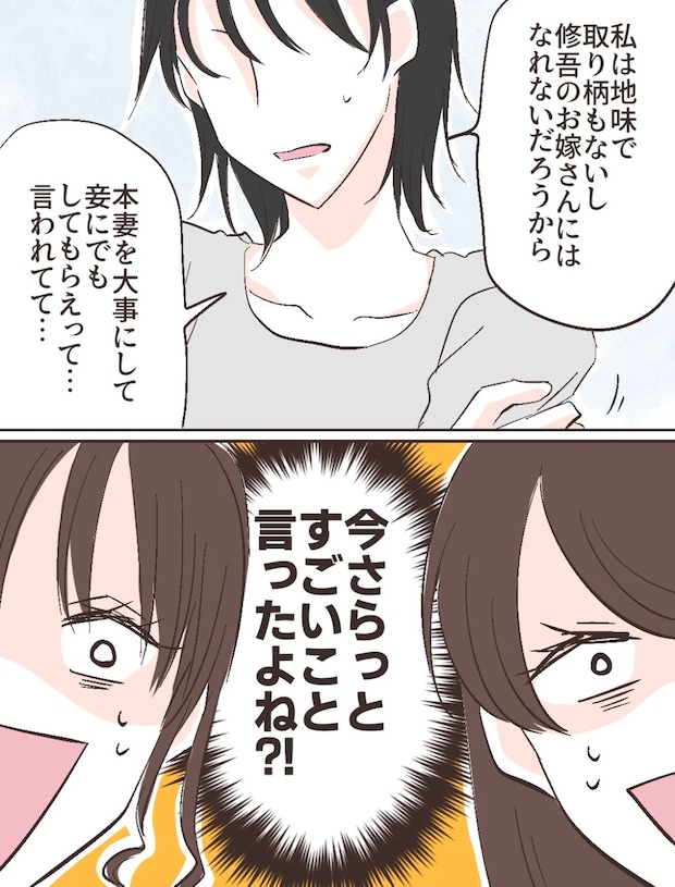 「私は地味で取り柄もないし、修吾のお嫁さんにはなれないだろうから、本妻を大事にして妾にでもしてもらえって言われてて・・・」智美さんは、小さな声でそう打ち明けました。あまりにも衝撃的な言葉に、私とふみのは一瞬フリーズ。め、妾って・・・今、さらっとすごいこと言ったよね!?