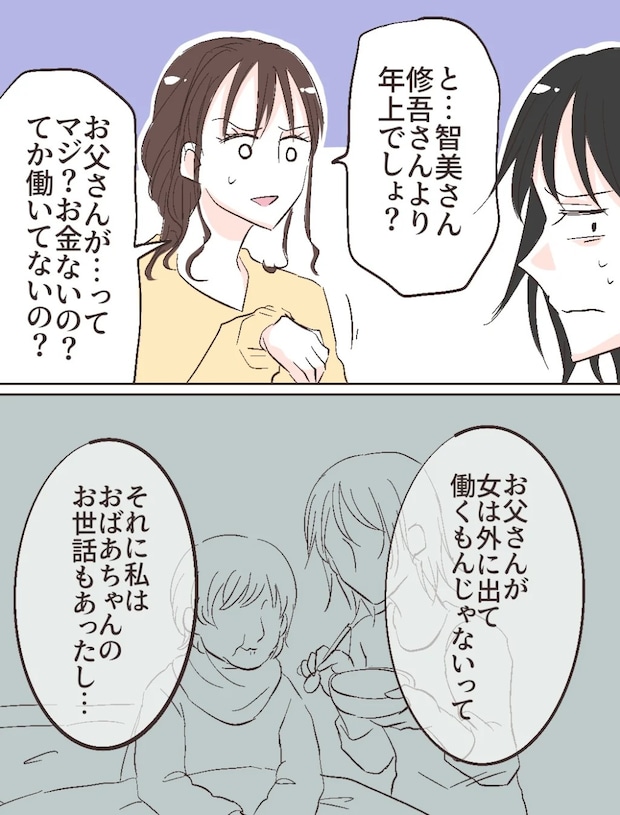 するとふみのが、「と、智美さん修吾さんより年上でしょ?お父さんがってマジ?お金ないの?てか働いてないの?」と矢継ぎ早に質問します。智美さんはさっきまでの勢いが嘘だったかのように大人しくなり「お父さんが女は外に出て働くもんじゃないって、それに私はおばあちゃんのお世話もあったし・・・」と消え入りそうな声で話し始めました。