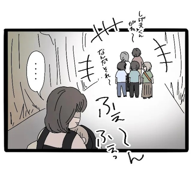 アオを抱っこし、ママバッグを抱えてなんとか遅れないように歩く私ですが、観光に夢中な義両親とコウタにはそんなことはどうでもいいみたい。さすがに疲れてきてアオの抱っこをコウタに代わってほしくても、コウタは「大丈夫~?ゆっくり歩いてきなよ~」と声をかけるだけ。アオをかまってくれる様子はみじんもありません。