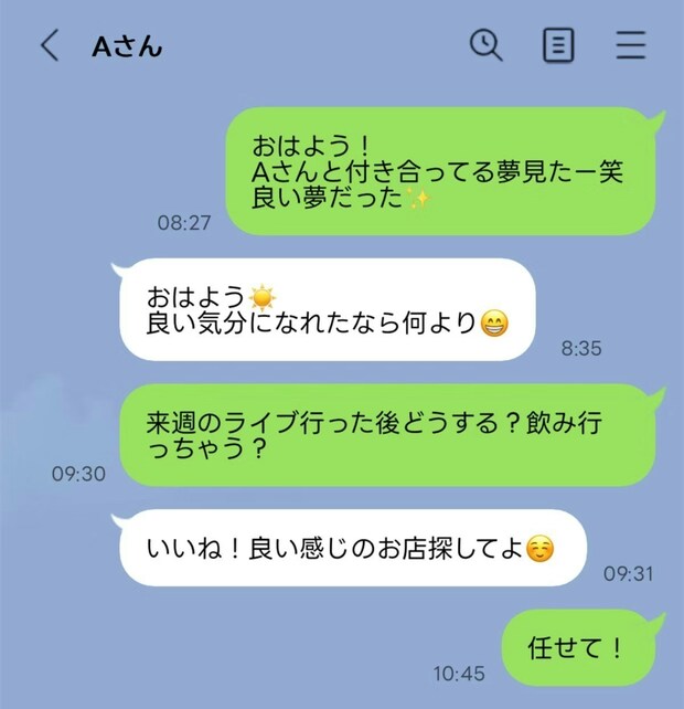 夫からおはよー!って送ってて、ほぼ毎日やりとりしてます。内容は他愛もないことですが、2人で飲みに行ったり今度ライブに行くと言ってましたがその女と一緒に行くようです。決定的な不倫の内容はないですが、「〇〇と付き合ってる夢見たー笑」「いいね教えてくれてありがとう」みたいなやりとりもあり気分悪いです