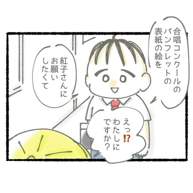 紅子さんが描いた絵のこと、担任の先生が覚えてくれていました。さらに、合唱コンクールのパンフレットの表紙をお願いしたい、と。これはうれしいですね。