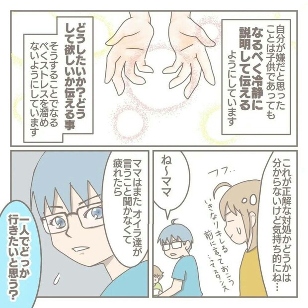 「母親なんだから、なんとかしないと」という思いで自分を苦しめてしまったヨカさんでしたが、ある日、思い切って一泊二日、一人で家を空けることにしました。日常生活に煮詰まってしまったときにはリフレッシュや、つらいことからあえて目を離してみる時間が必要ですね。