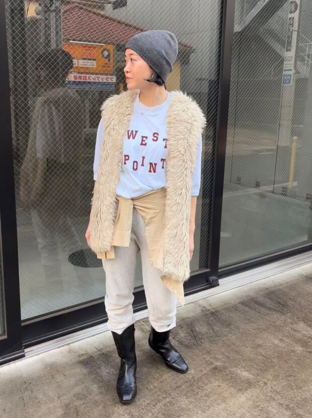 「3月でもまだ寒さが残るので、ファー素材のベストを羽織ることで冬と春の間の季節感を出しています。重たくならないように明るい色味を選び、軽やかさをキープしています」