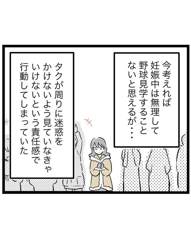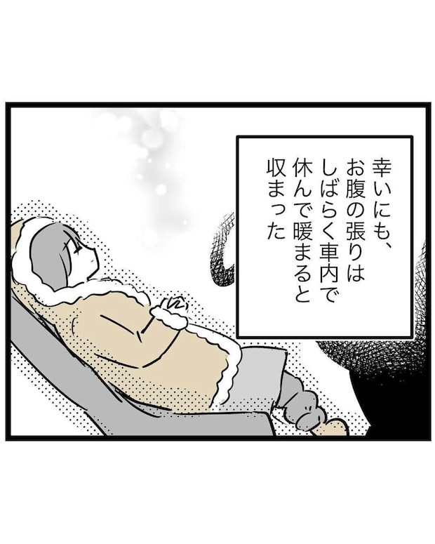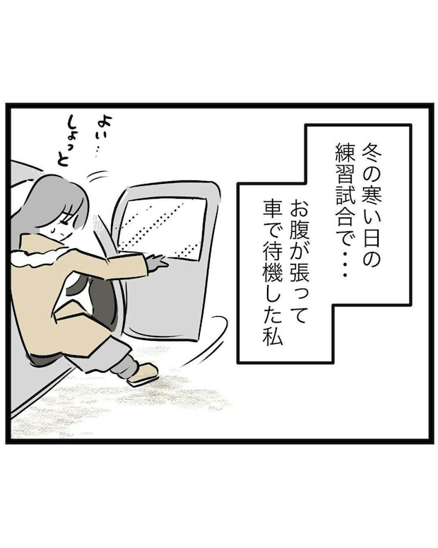 チーム内で孤立しながらも、楽しそうに野球をする息子の姿に退団できずにいたもっつんさん。妊娠中の体を気遣いながらも、休みにくい空気に押され、無理をして応援を続けていました。そんな真冬の練習試合の日、おなかの張りを感じ、もっつんさんは車の中で休むことにしました。