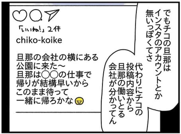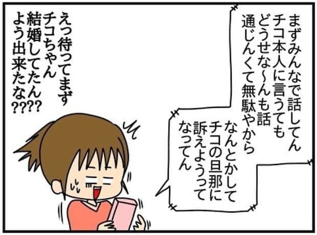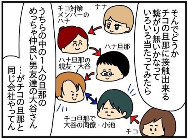 被害を受けた仲間たちで話し合い、チコちゃん本人ではなく、彼女の夫に間接的に伝える作戦を立て、投稿内容から勤務先を割り出し、共通の知人を介してチコちゃんの夫へ接触します。夫は何も知らなかった様子ながらも「思い当たる節はある」と語り始めました。