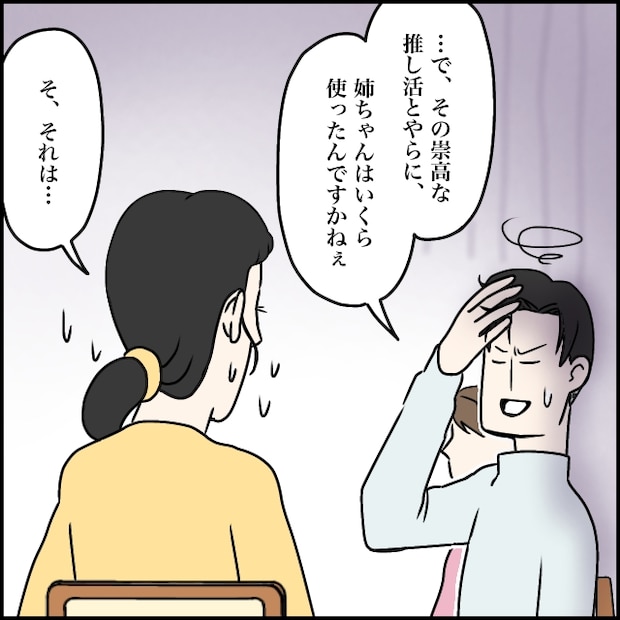 太一が頭を抱えながら「・・で、その崇高な推し活とやらに、姉ちゃんはいくら使ったんですかねぇ」と聞くと、「そ、それは・・」と口籠る玲美さん。