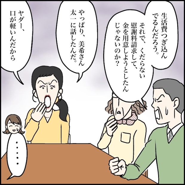 「生活費つぎ込んでるんだろう。それで、くだらない慰謝料請求して、金を用意しようとしたんじゃないのか?」義父がそう指摘すると、「やっぱり、美希さん太一に話したんだ。ヤダー、口が軽いんだから」と自分のしたことを棚に上げて私を非難する玲美さん。私は苦笑いすることしかできませんでした。