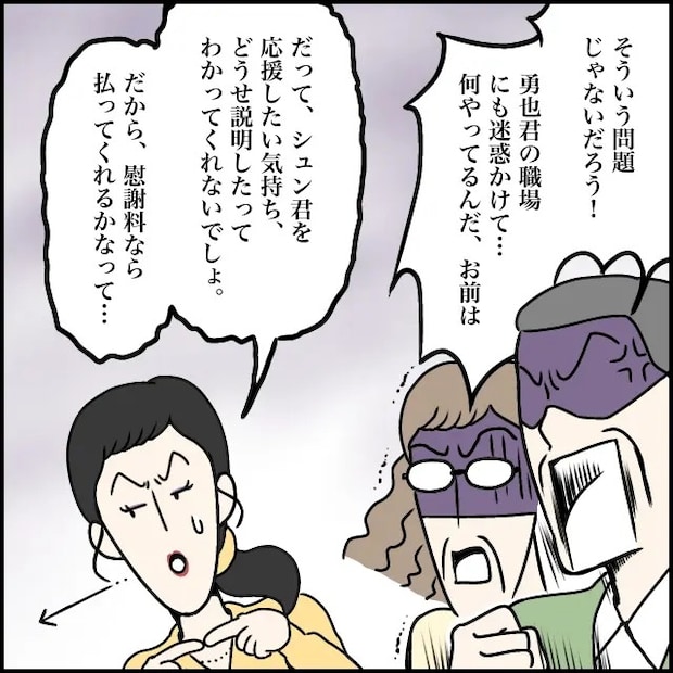すると、「そういう問題じゃないだろう!勇也君の職場にも迷惑かけて・・何やってるんだ、お前は」と義父が怒り心頭で声を荒げ、義母も怒りに震えていました。玲美さんはそんな義両親から目を逸らし「だって、シュン君を応援したい気持ち、どうせ説明したってわかってくれないでしょ。だから、慰謝料なら払ってくれるかなって・・」と身勝手な言い訳を始めました。