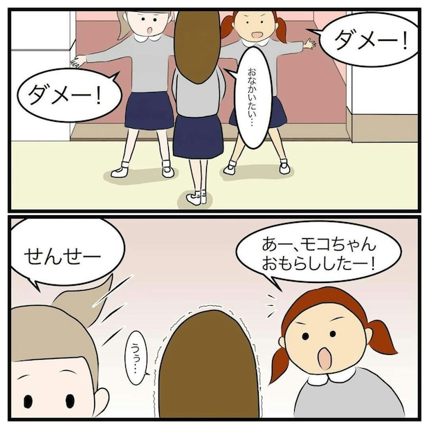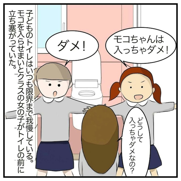 幼稚園生のモコちゃんは、ある日トイレに行こうとしました。しかし、入り口には女の子2人組が立ちはだかり、モコちゃんはトイレを使わせてもらえませんでした。突然の意地悪にモコちゃんはとても驚きましたが、このことを先生には話しませんでした。