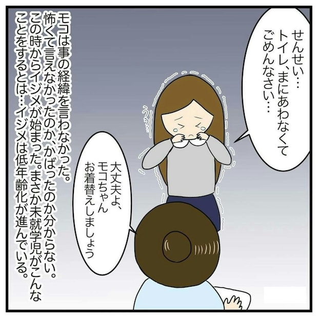 モコちゃんは、2人の女の子から意地悪をされてしまい、トイレを使うことができずにお漏らししてしまいました。突然始まったいじめに、モコちゃんはとても動揺し、自分から先生に意地悪されたことを伝えることができませんでした。