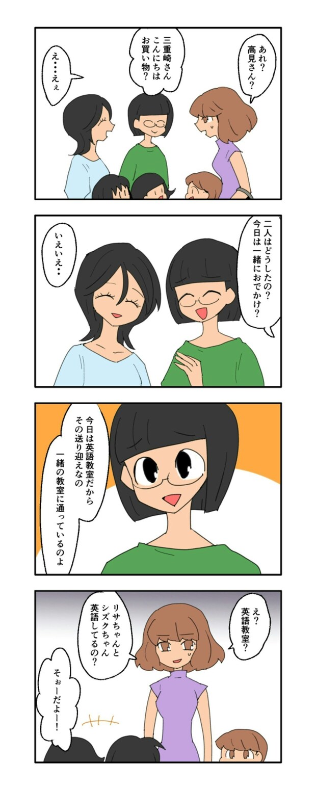 ハルミは街中で、英語教室に子どもを送迎している高見さんと三村さんに出会いました。話を聞くと、2人とも子どもたちにスイミングやバレエなども習わせているそうです。それを知ったハルミは、息子のコウキにも何か習い事を始めさせなければと、焦る気持ちになりました。