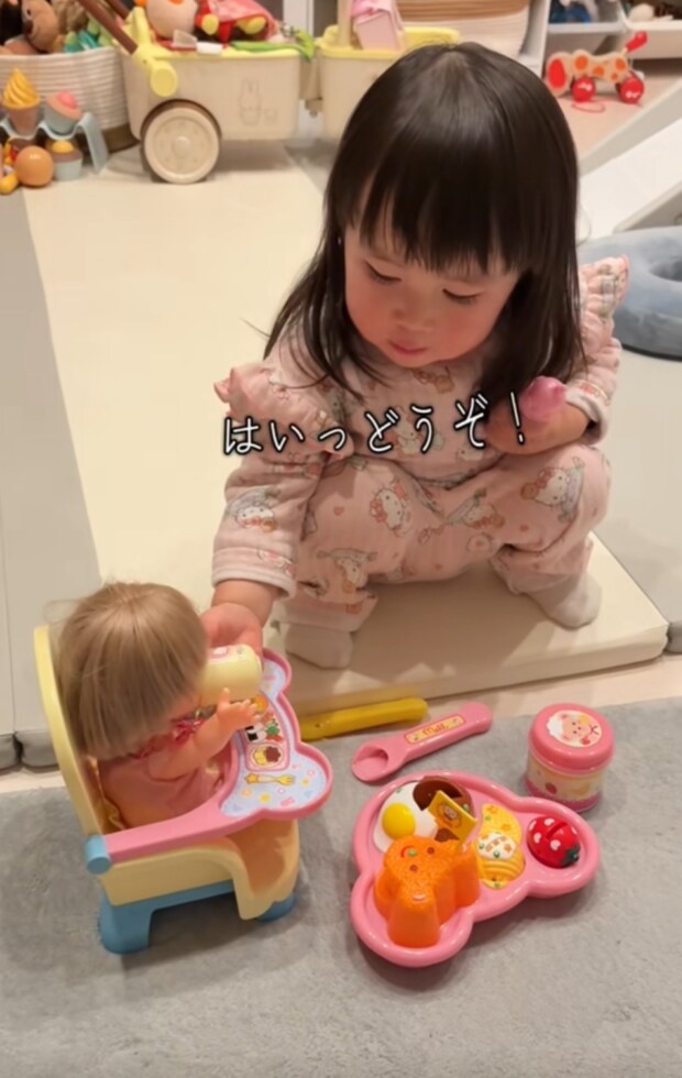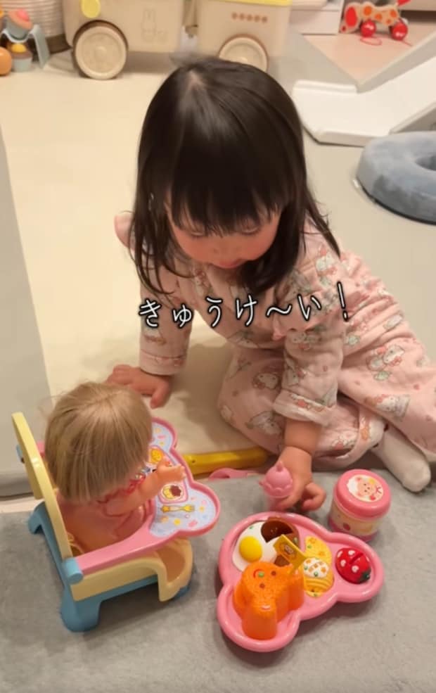 メルちゃんとおままごとを楽しむ女の子。最初は熱心にミルクをあげていたのに、途中で「休憩」を入れて……?(笑)。