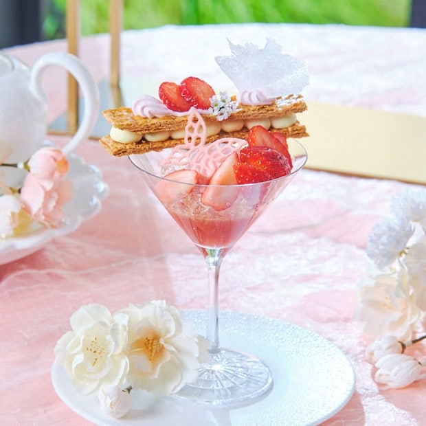 「いちごと桜のミルフィーユパフェ」1,800円は、桜といちごのジュレ、シャンパンジュレに桜のミルクアイスを重ねた、春爛漫のデザート。桜色のマカロンや蝶の形のチュイールが飾られ、まるでグラスの中に春の景色を閉じ込めたよう。さっぱりとしたシトラスの風味が広がるドリンク「シトラススプリング」1,200円も併せて楽しんで。