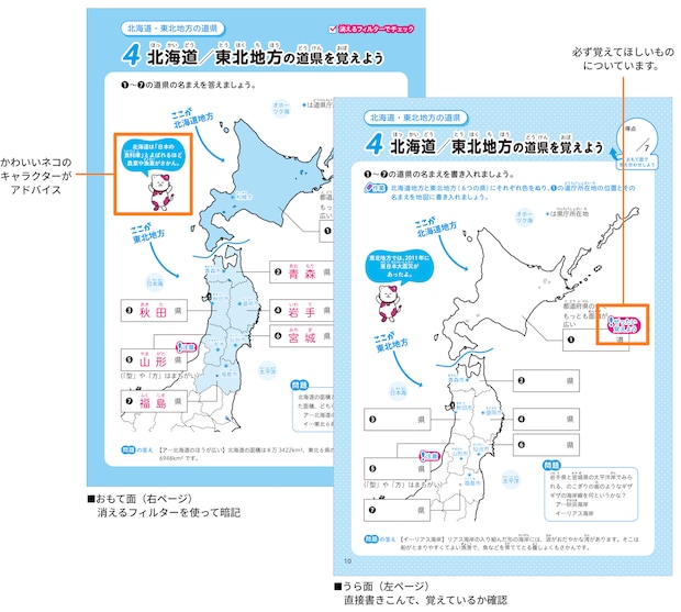 表ページは消えるフィルターを使ってチェック、裏ページは表と同じ問題を書いて確認。同じ地図をくり返し学習することで知識を定着させます。