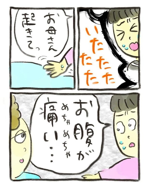 突然の腹痛に、寝ていた母を起こして痛みを訴えたおたんこ助産師さん。心配する母に痛む場所やどんな症状なのかを伝えました。
