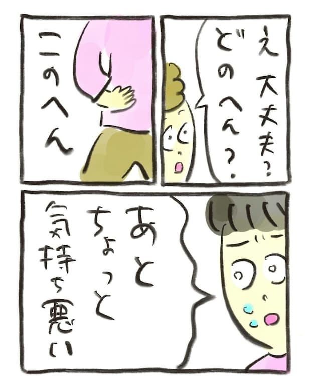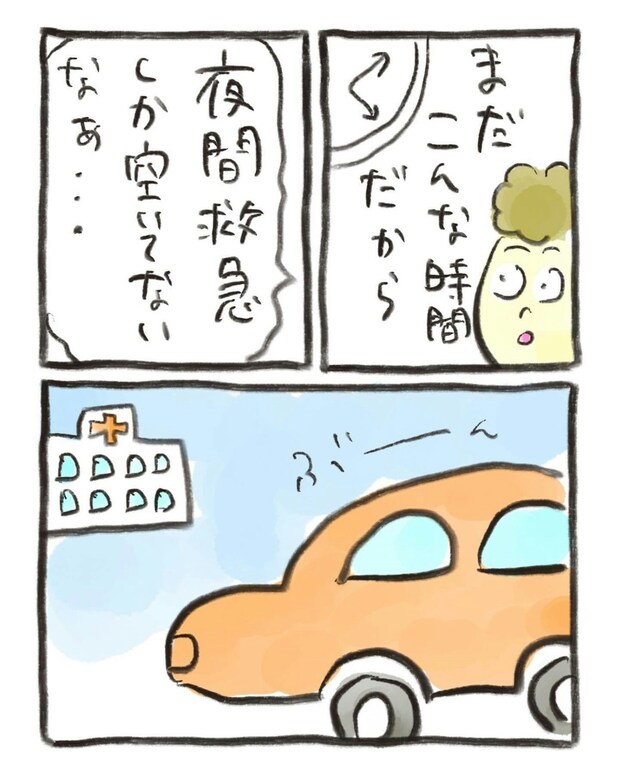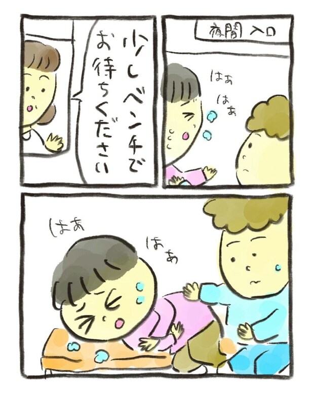 あまりに苦しそうな娘の様子に、母は夜間救急外来へ連れて行くことにしました。病院の待合で待っている間もおたんこ助産師さんは座っていられないほどつらそうです。