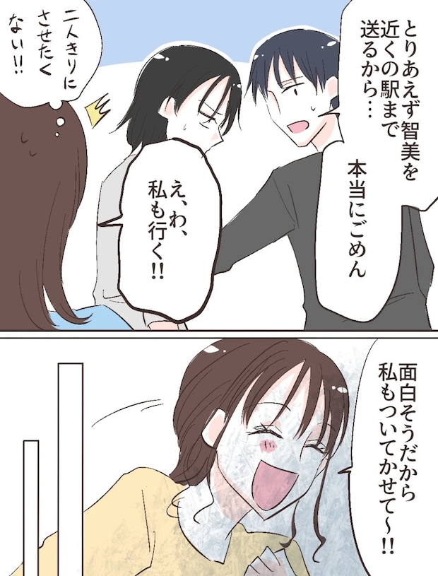 修吾は「とりあえず智美を近くの駅まで送るから・・・本当にごめん」と言うと、智美さんを連れて家を出ていきました。2人きりにさせたくなかった私は、「わ、私も行く!」と慌てて後を追います。すると、なぜかふみのも「面白そうだから私もついていかせて~!」と一緒についてきました。