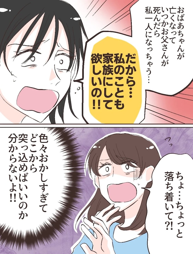 「おばあちゃんが亡くなって、いつかお父さんが死んだら私1人になっちゃう・・・だから私のことも家族にして欲しいの!」と必死に訴える智美さん。色々おかしすぎてどこから突っ込めばいいのか分からなかった私は、「ちょ、ちょっと落ち着いて!?」となだめます。